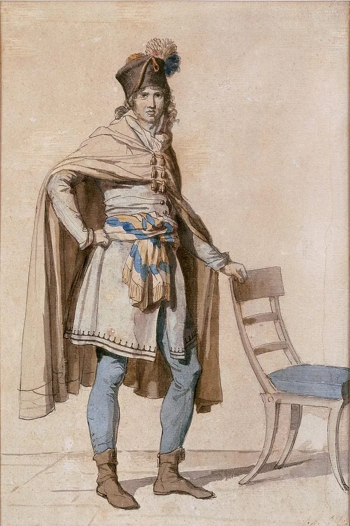 Visiting the Jacques-Louis David exhibition at the Louvre the other day, I stumbled upon his preparatory sketches from 1794, commissioned by the Convention, to design new outfits for every revolutionary office, and even a “national costume” for all French citizens.